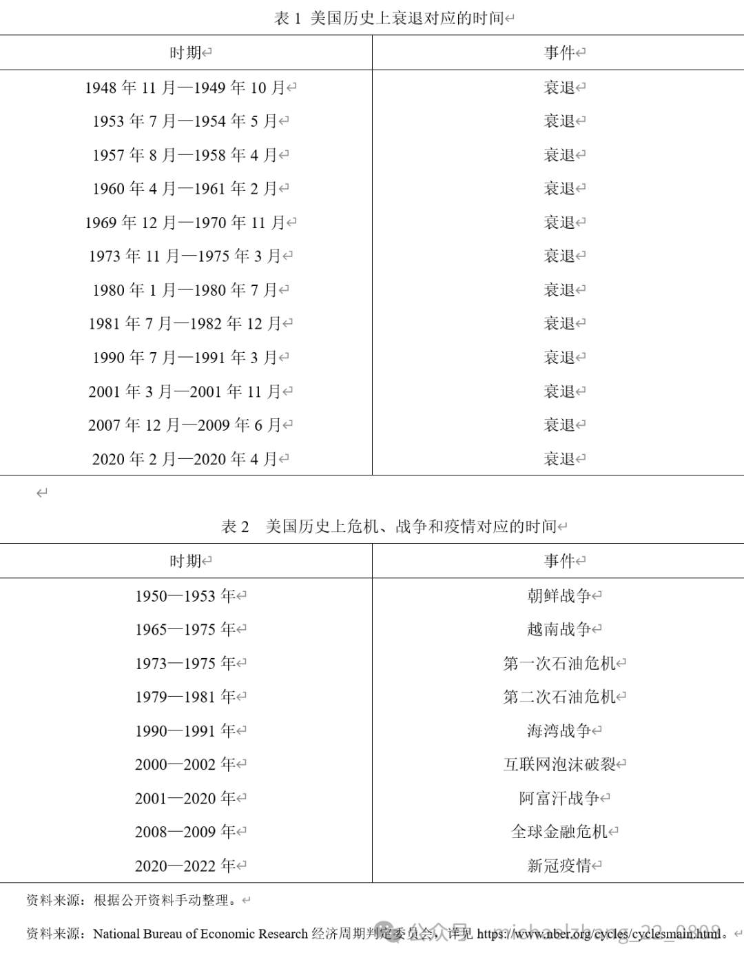 根据定义,基本收支差额等于财政收入减去财政基本支出,因而财政基本收支差额占GDP的比例主要取决于政府的财政政策(主要是政府支出政策和税收政策)。当政府增加政府支出以及减少税收时,短期内财政基本收支差额占GDP的比例可能下降。鉴于危机、战争、疫情和衰退等重要事件也会通过政府的财政政策以及经济发展水平等渠道影响基本收支,本文接下来结合美国财政政策思想的演变,进一步考察这些事件对美国财政基本收支的作用。表1整理了美国历史上衰退对应的时间,表2整理了美国历史上重大危机、战争和疫情对应的时间。