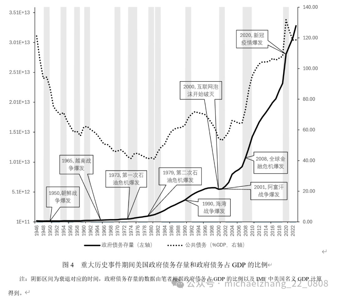 在1946年至1980年间,美国政府债务存量缓慢上升,从1946年的2760亿美元上升至1980年的1.2万亿美元,年均增长约4.7%。而在1981年至2023年间,美国政府债务存量经历了爆发式增长,从1981年的1.32万亿美元上升至2023年的32.9万亿美元,年均增长高达8.0%。在大多数衰退、危机和战争期间,美国政府债务存量均显著上升,特别是在阿富汗战争爆发后以及全球金融危机和新冠疫情期间。