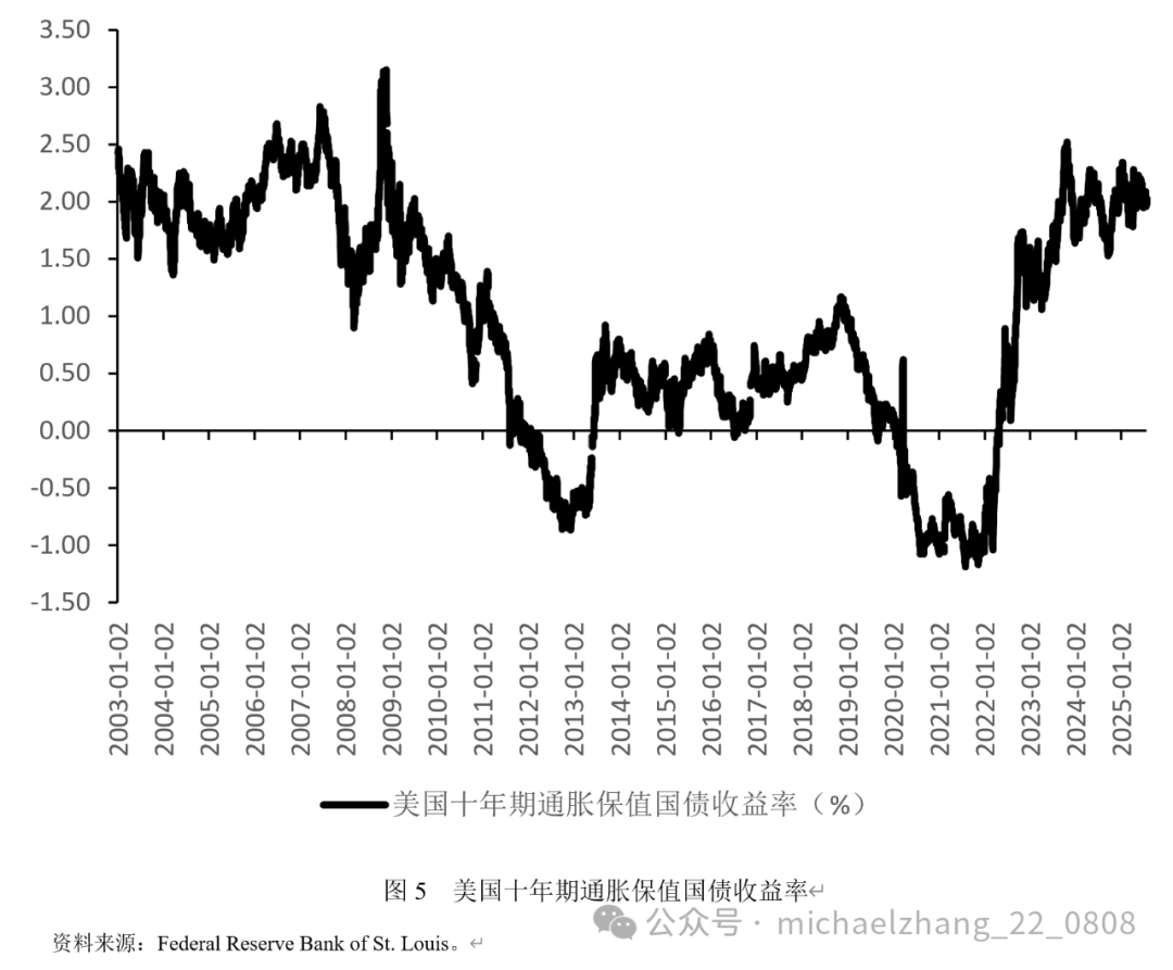 由上述理论可知,美国政府债务是否可持续主要取决于长期实际利率是否小于经济实际增速以及当前政府债务存量。美国的十年期通胀保值国债(Treasury Inflation-Protected Securities,TIPS)收益率是最具代表性的长期实际利率,从图5可以看出,在全球金融危机后,美国的长期实际利率经历了明显下行并长期保持在较低水平。但从2022年初开始,美国的长期实际利率不断上行,并在2024年11月至2025年7月间长期保持在2%这一较高水平附近。对于美国经济增速而言,正常年份GDP实际增速在2.5%附近波动。虽然如今美国GDP实际增速仍然高于长期实际利率,但不断攀升的长期实际利率意味着美国的财政可持续性明显下降。如今美国政府债务占GDP的比再度达到120%的历史高位,如果美国长期实际利率继续稳定在较高水平,一旦外部冲击使美国GDP实际增速下滑,美国财政可持续性很可能会急剧下降。