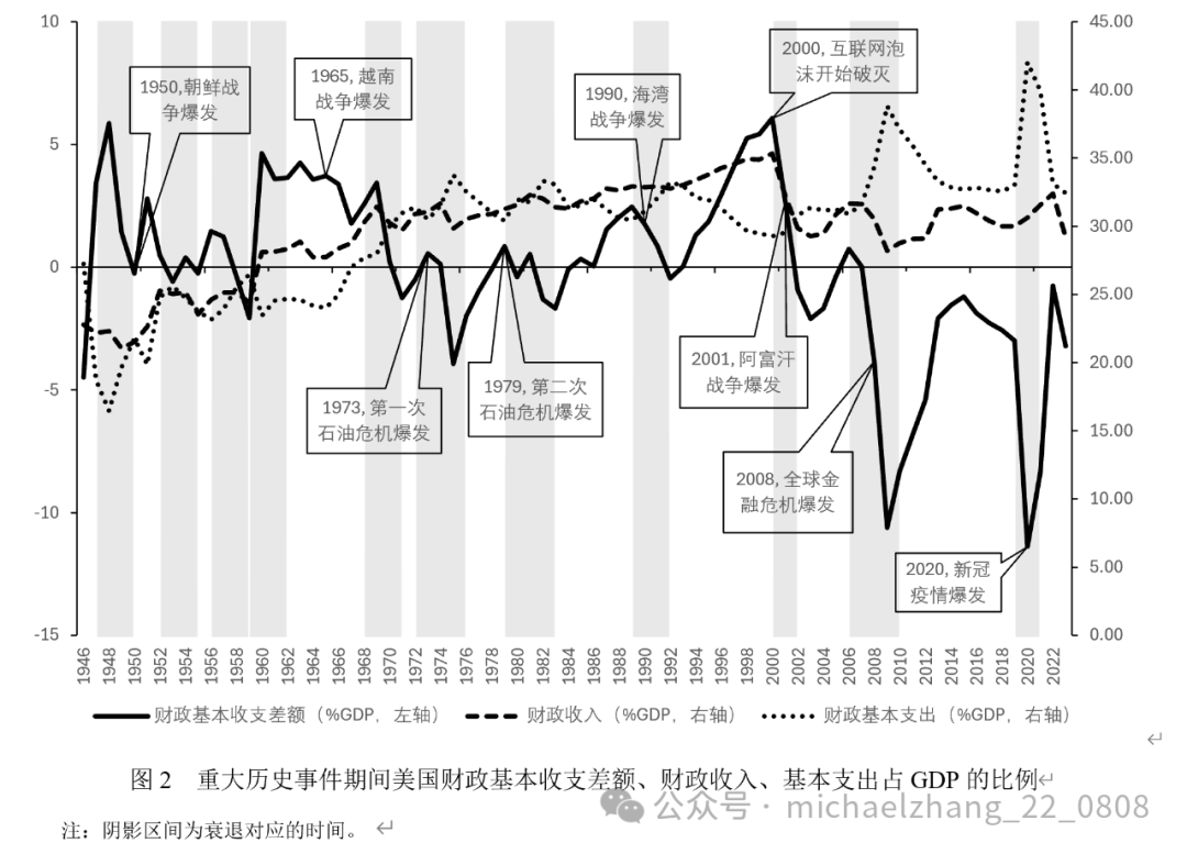 在1973年至1975年第一次石油危机和1979年至1981年第二次石油危机期间,美国经济均出现“滞胀”。但两者区别在于:在第一次石油危机期间,美国政府为刺激总需求,实施扩张性的财政政策,大幅减税并提高政府支出,导致财政收支状况迅速恶化。而在第二次石油危机期间,美国政府为抑制通胀,实施紧缩性财政政策,削减政府预算以及反对减税,财政收支状况并未恶化。2000年至2002年互联网泡沫破裂和2008年至2009年全球金融危机呈现出相似特征,财政收入占GDP的比例均显著降低,基本支出占GDP的比例上升。但两次危机期间财政政策呈现明显差异:在互联网泡沫破裂期间,美国政府奉行里根主义,全面减税并大幅增加国防和社会福利支出。而在全球金融危机期间,美国政府以“银行注资+大规模基建+产业纾困”的财政政策应对系统性崩溃,两者在资金规模和资金投向上呈现明显差异。