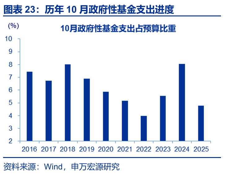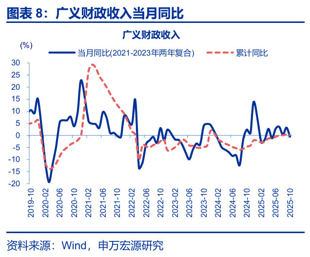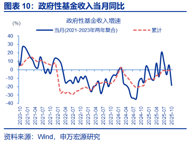 10月广义财政支出增速“骤降”,部分缘于2024年同期高基数影响及收入端掣肘。2024年9月以来,广义财政支出持续提速,10月当月同比达20.4%,较9月增速提升7.8个百分点;彼时支出大幅提速一是因为广义财政收入明显修复,10月当月同比2.4%,较9月同比增长约4个百分点,二是因为2024年10月地方新增专项债基本发行完毕且正加快使用。相比2024年同期,10月广义财政收入回落,较9月同比下降3.8个百分点;政府性基金收入尤为明显,进一步掣肘广义财政支出发力。