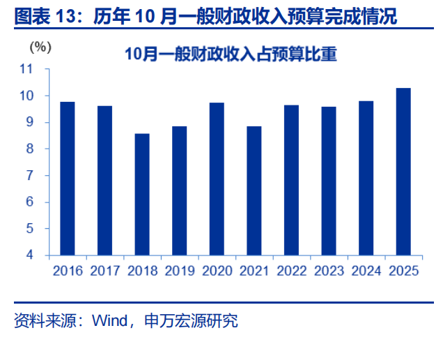 税收收入维持稳定,非税收入降幅走阔,导致一般财政收入小幅回落。2025年10月,一般财政收入同比3.2%,较9月回升0.6个百分点;非税收入降幅明显走阔,10月同比-33%、较9月降幅走阔21.5个百分点;税收收入维持稳定,10月同比8.6%,与9月增速基本持平。高基数影响下,印花税增速明显回落,10月同比9.4%;国内个人所得税、国内消费税有所改善,10月增速分别较9月提升10.6个百分点、0.6个百分点,达27.3%、4.4%;土地和房地产相关税收降幅延续收窄,10月同比-1.4%。2025年10月一般财政收入预算完成10.3%,高于过去五年同期平均的9.4%。