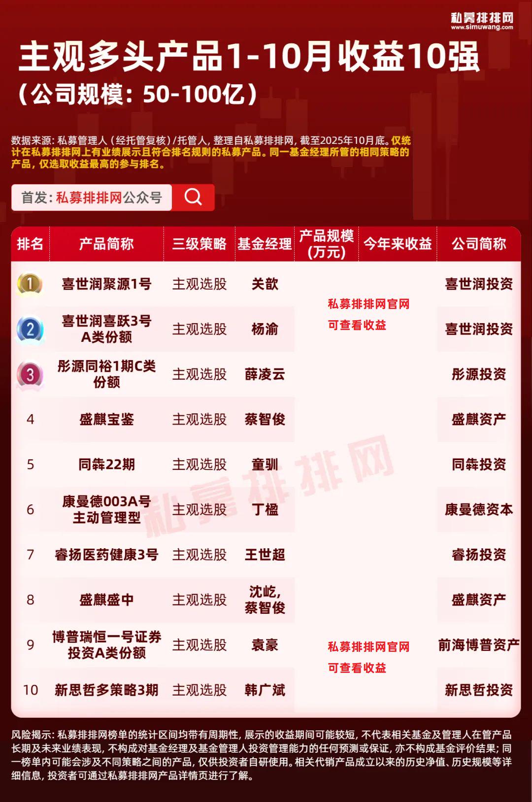 50-100亿私募规模组前10强主观多头产品的上榜“门槛”超***%,今年1-10月收益居前3的产品来自:喜世润投资和彤源投资。