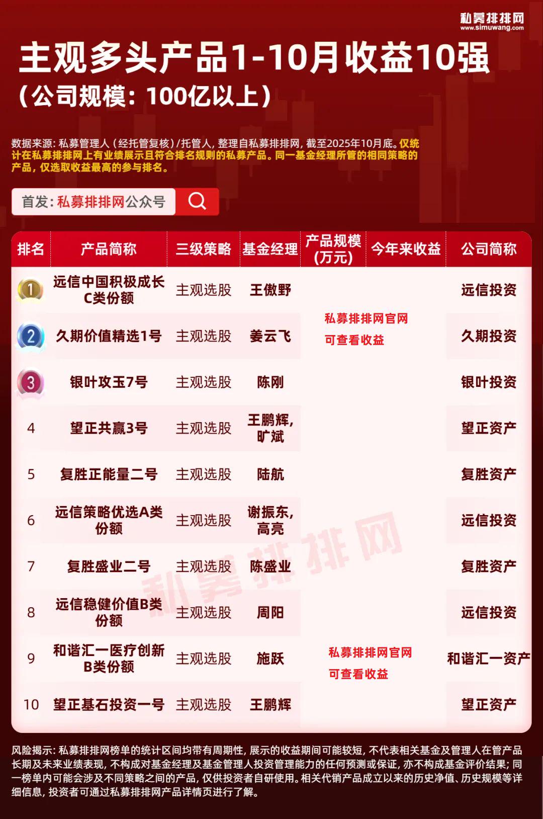 另外,在百亿私募今年来主观多头产品收益排名中,远信投资除了王傲野管理的“远信中国积极成长C类份额”夺冠外,还有谢振东和高亮管理的“远信策略优选A类份额”、周阳管理的“远信稳健价值B类份额”也一同上榜前10强,今年1-10月收益分别为***%。