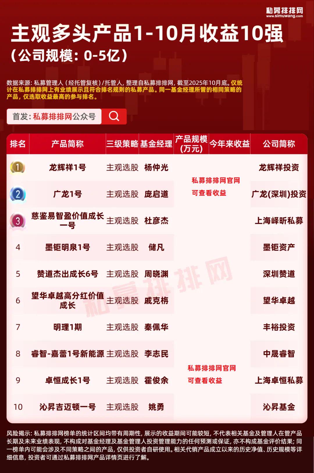 0-5亿私募规模组前10强主观多头产品的上榜“门槛”达***%,今年1-10月收益居前3的产品分别来自:龙辉祥投资、广龙(深圳)投资、上海峄昕私募。
