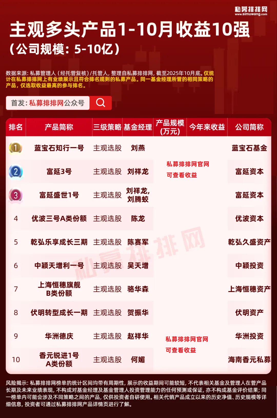 5-10亿私募规模组前10强主观多头产品的上榜“门槛”超***%,今年1-10月收益居前3的产品来自:蓝宝石基金和富延资本。