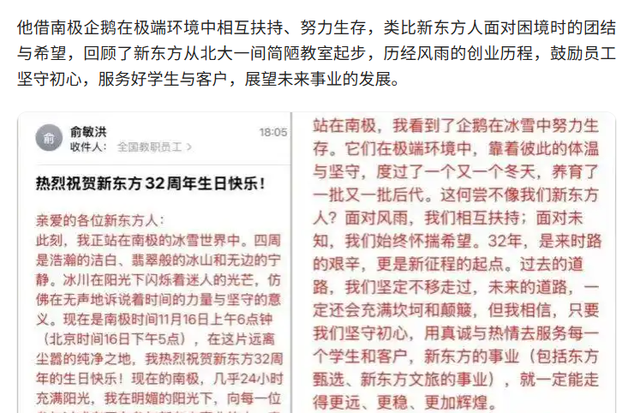 具体而言,俞敏洪曾在信里用南极、企鹅来借指新东方人在困难面前相互支持,希望大家能保持团结继续服务好学生、客户,让企业走得更为久远。但这封从南极寄来的全员信,却在员工、网友眼里变成了无法共情的鸡汤。