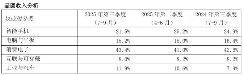 按照下游应用领域划分,中芯国际晶圆收入主要分为智能手机、电脑与平板、消费电子、互联与可穿戴、工业与汽车等五大类。今年第三季度,中芯国际来自智能手机的收入占比为21.5%,较第二季度的25.2%出现显著下降;电脑与平板的收入占比为15.2%;消费电子的收入占比从二季度的41.0%增至43.4%,互联与可穿戴的收入占比为8%;工业与汽车的收入占比也从二季度的10.6%进一步增加至11.9%。