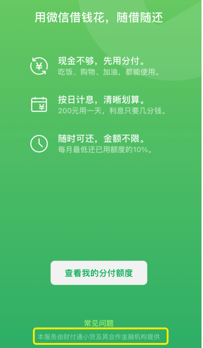 另外,凭借微信与手机QQ钱包页面的固定入口,微粒贷能以极低成本的方式触达海量用户。相比之下,许多现金贷公司不得不通过在超市、商圈等高人流区域推行“扫码借款”来获取客户,或者跟短视频、电商、线下服务这些高频场景合作,向广告公司支付高昂佣金或向平台买流量。