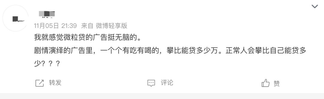 这个让人猝不及防的短剧广告,正是出自微众银行旗下微粒贷的手笔。社媒平台上,不少网友吐槽微粒贷的广告“剧情雷人”、“多得泛滥”。