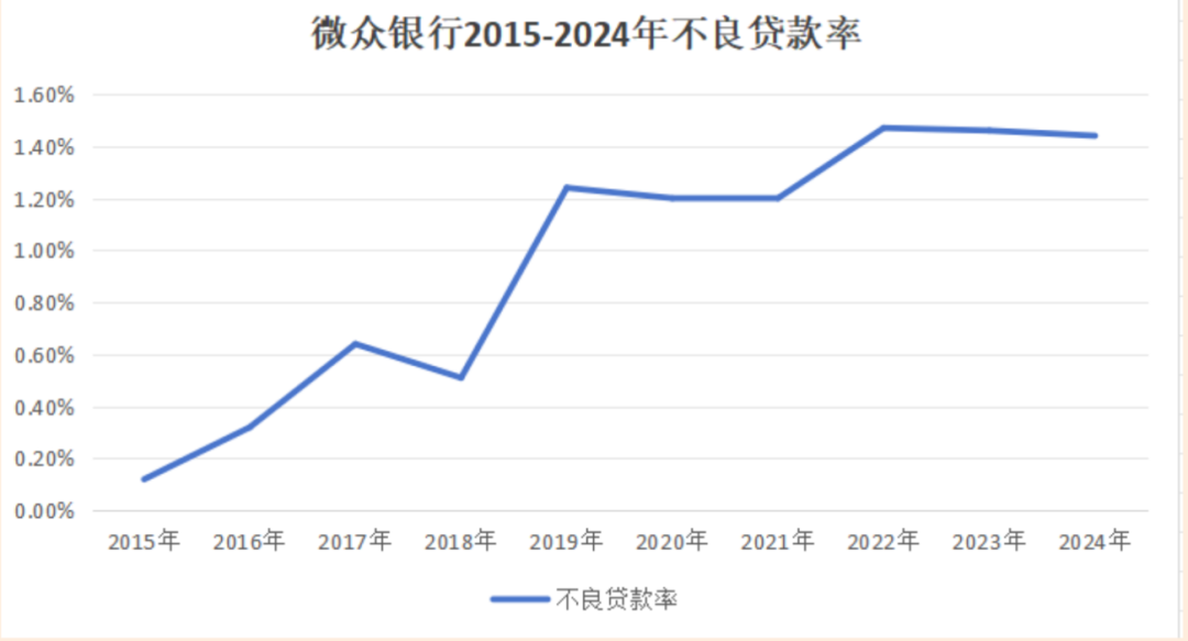 而拓客增加、客群下沉也在推高着微众银行的信用风险。截止2024年底,微粒贷客户中约85%为大专及以下学历,并有18%为在传统金融机构无信贷记录的“首贷户”,这部分客群在经济下行期更为脆弱。从财报可知,微众银行的不良贷款率在过去十年间持续攀升,从2015年的0.12%上升至2025年上半年的1.57%,整体风险敞口正在加大。