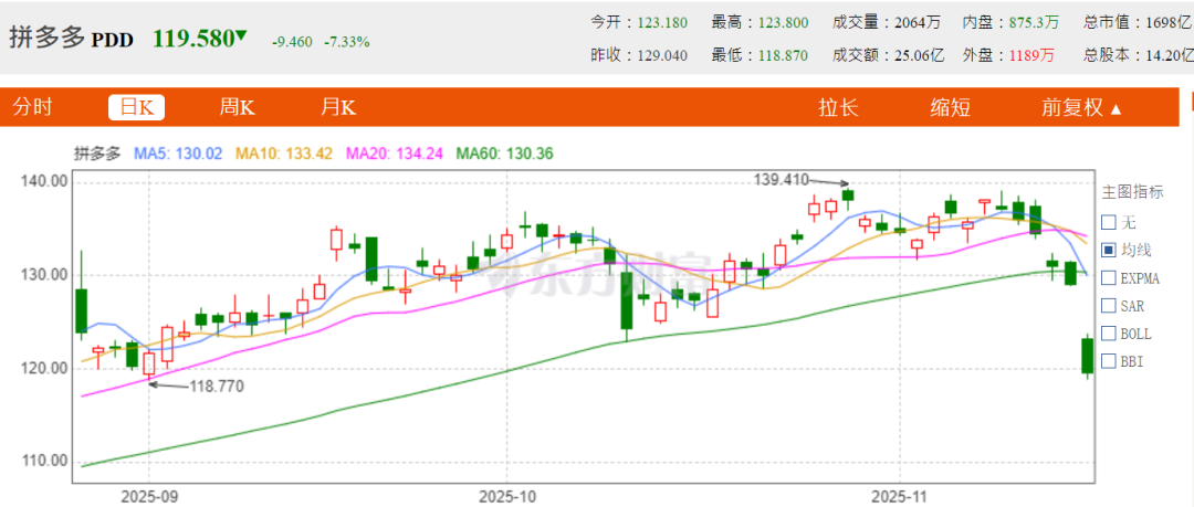 股价这边更撕裂:11月18日,拼多多美股大幅低开,当日收盘跌了7.33%,每股价格为119.58美元。
