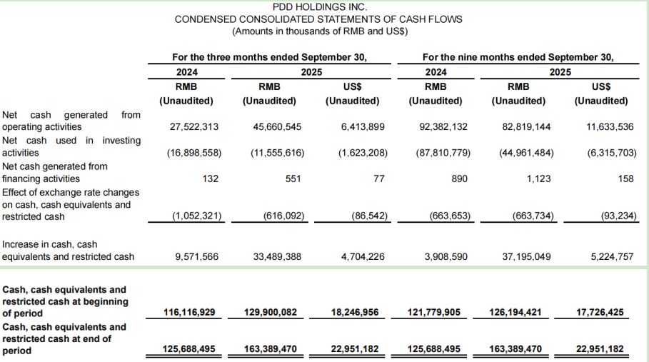 要知道拼多多目前根本不差钱:财报显示,截至三季末其现金、现金等价物及短期投资合计达4238亿元,较2024年末增长 27.8%。如此充裕的现金储备,却没有转化为高效的资本运作。