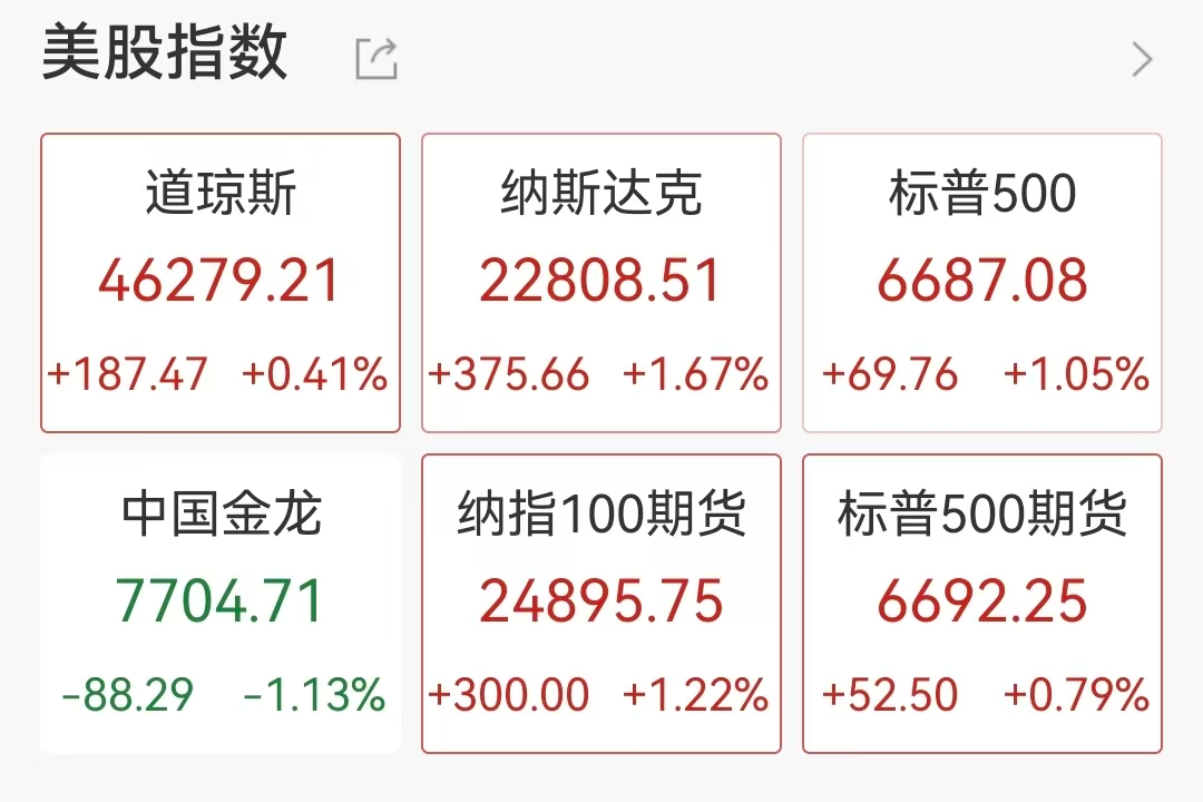 11月19日,美股开盘三大指数上涨,截至23:16,道指涨0.41%,纳指涨1.67%,标普500指数涨1.05%。