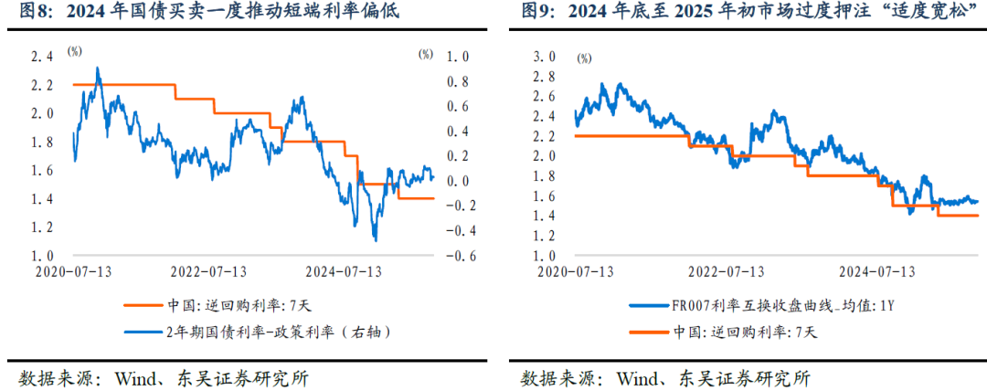 政策利率与市场利率。2024年7月份以后,7天期逆回购利率不仅成为DR001和DR007等关键期限货币市场利率的定价锚,而且亦是1-3年期等短端国债收益率的定价锚,“在利率传导机制顺畅的情况下,短端货币市场利率会围绕政策利率中枢运行,并通过金融体系传导影响整个市场利率的水平”,但是2024年下半年至2025年一季度,一方面因为债券市场供需失衡叠加国债持续净买入,1-3年期国债利率曾大幅度偏离主要政策利率,成为长端利率快速下行的催化剂;另一方面,2024年12月至2025年2月因为对“适度宽松”政策基调的预期偏高,透支了近40bps的“降息”预期,出现市场利率快于政策利率大幅下行的局面。2025年二季度以来,政策利率和市场利率之间的分歧显著下降,关键期限货币市场利率和短端国债收益率基本做到了围绕政策利率波动。展望2026年,在流动性调控机制更加成熟、利率走廊进一步完善的基础上,关键期限货币市场利率或稳定围绕政策利率波动。