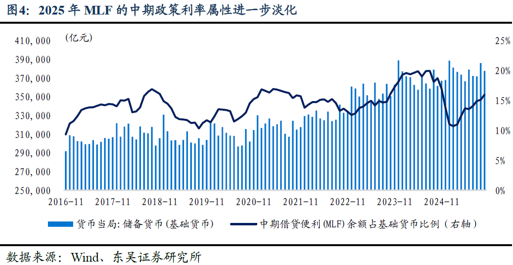 从中期和短中期流动性投放机制看,MLF进一步淡化政策利率属性、流动性操作规则化。2025年中期借贷便利(MLF)招投标模式调整为“固定数量、利率招标、多重价位中标”,在MLF操作利率的政策属性褪色之后,保留了投放中期流动性的调节功能,截至2025年11月17日,年初以来MLF累计投放9,610亿元,占基础货币余额的比例从年初的11%提升至10月末的16%。与MLF招投标模式相同的买断式逆回购今年以来也成为流动性的主要投放方式,并且今年以来基本形成每月5日前后开展3个月买断式逆回购、15日前后开展6个月买断式逆回购、25日开展1年期MLF的中长期资金投放模式。中期和短中期流动性投放更加透明和规则化,有利于稳定资金利率预期。