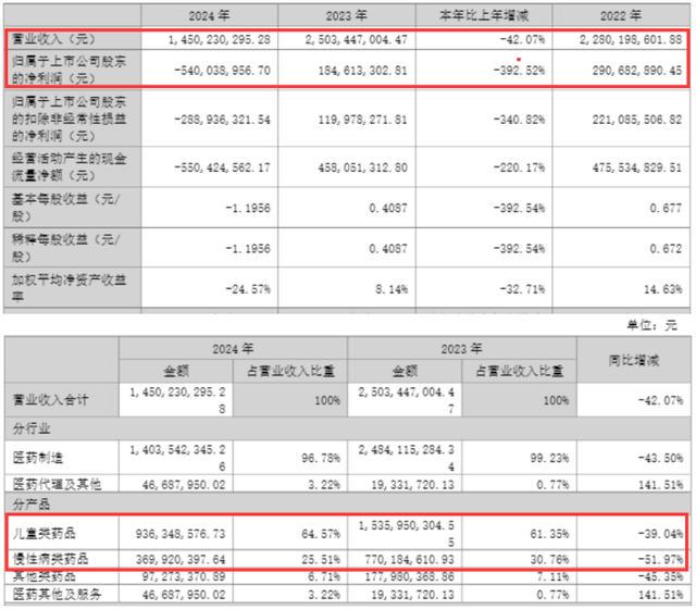 业绩层面,一品红自2024年起出现上市以来首次亏损,当年营收同比下降42.07%至14.50亿元,归母净利润巨亏5.40亿元,此前一年则为盈利1.85亿元。其两大核心产品——儿童药与慢性病药收入分别下滑39.04%与51.97%,毛利率也出现12.19%和42.29%的大幅下滑。