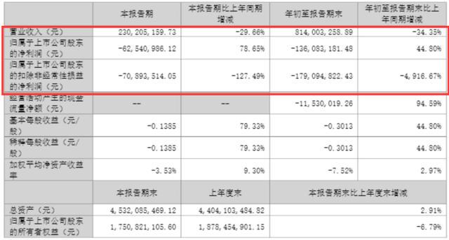 进入2025年,亏损态势仍未扭转,其前三季度实现营业收入8.14亿元,同比下降34.35%;实现归母净利润亏损1.36亿元,扣非净利润亏损1.79亿元,亏损进一步扩大。