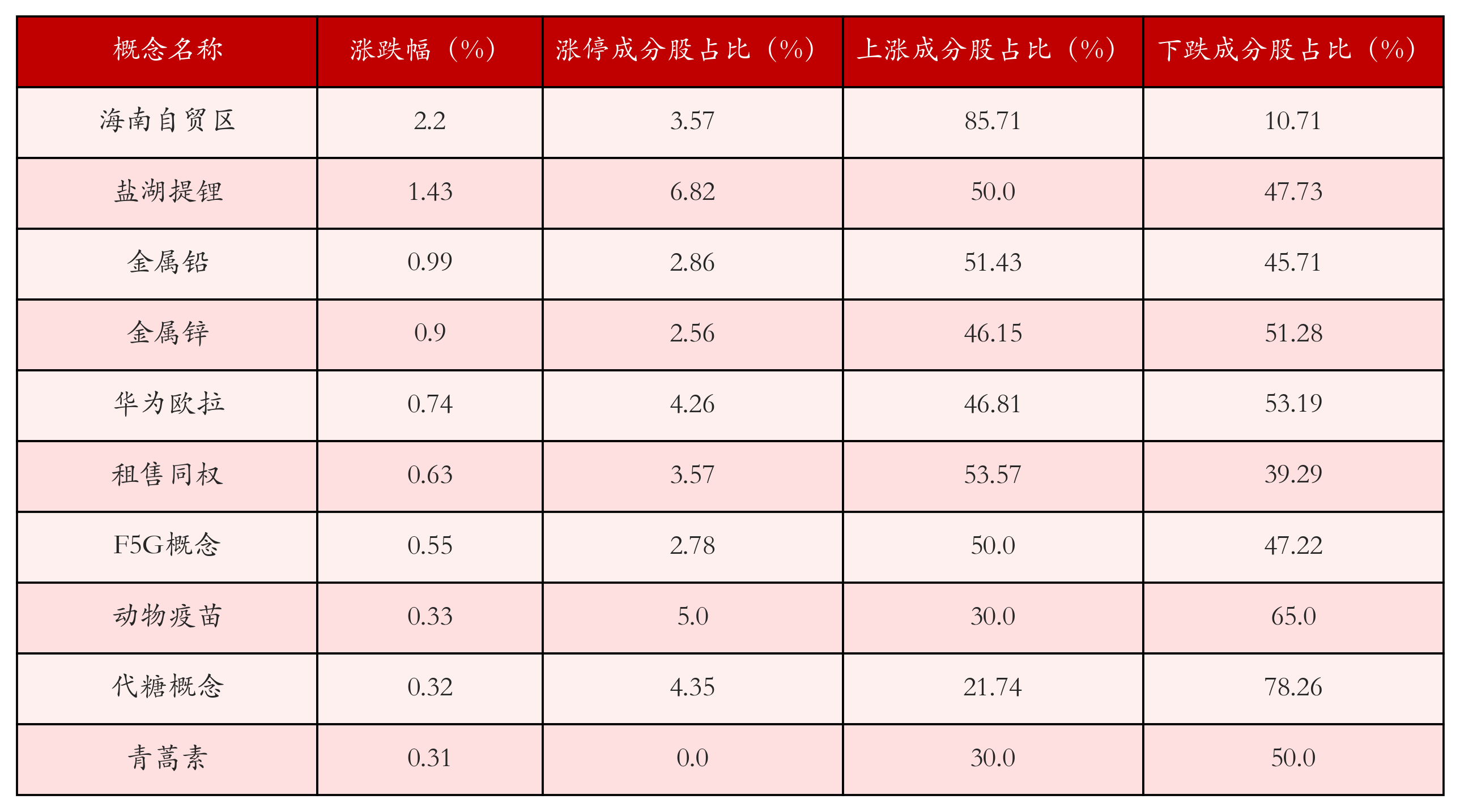 根据A股概念涨跌幅与所对应的股票池综合分析,涨幅靠前的三个概念板块分别为:海南自贸区、盐湖提锂与金属铅。排名前10位的概念板块相关数据见下表: