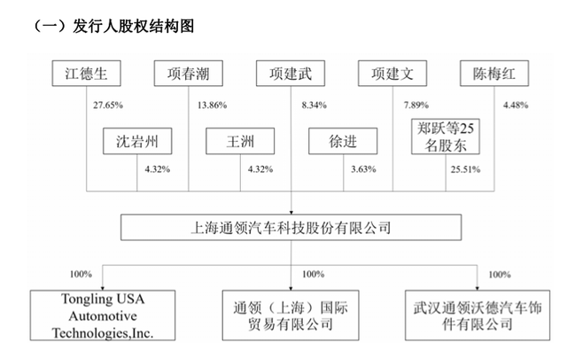 此时通领科技的股权结构为江德生为第一大股东,持股27.65%,项春潮、项建武、项建文分别持股13.86%、8.34%、7.89%。项建武、项建文为项春潮之子。项春潮为实际控制人,合计可实际支配64.078%股份。