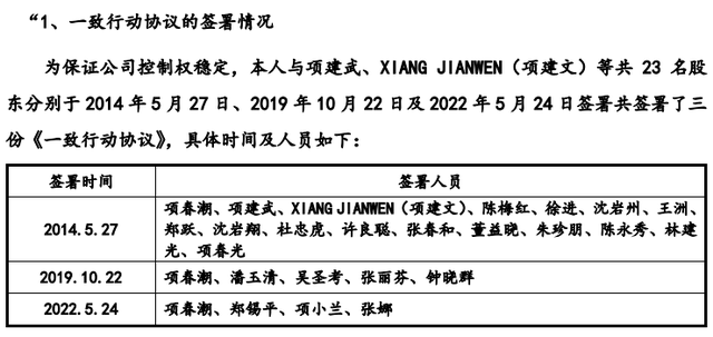 项氏家族的核心成员包括父亲项春潮以及他的两个儿子项建武和项建文。项氏家族不仅依靠直接持股,还通过一致行动协议扩大其控制范围。项春潮与另外23位股东结成一致行动人。
