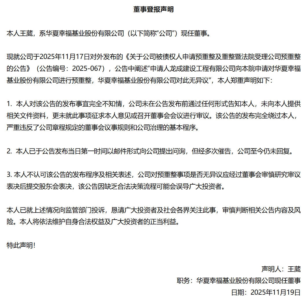 华夏幸福董事王葳发布登报声明称,对公司预重整相关公告的发布“完全不知情”,且该公告“严重违反了公司章程规定的董事会议事规则和公司治理的基本程序”。王葳表示,本人不认可该公告的发布程序以及相关表述,并已就上述情况向监管部门投诉。