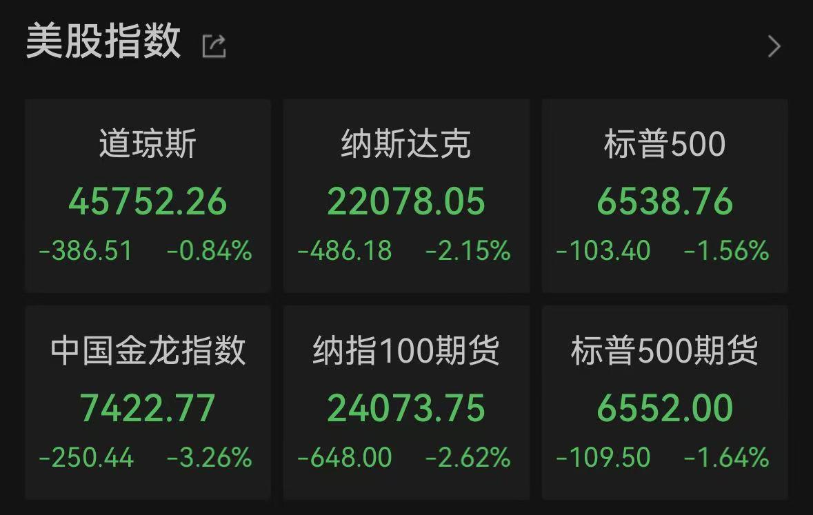 截至收盘,道指跌0.84%报45752.26点,标普500指数跌1.56%报6538.76点,纳指跌2.15%报22078.05点。