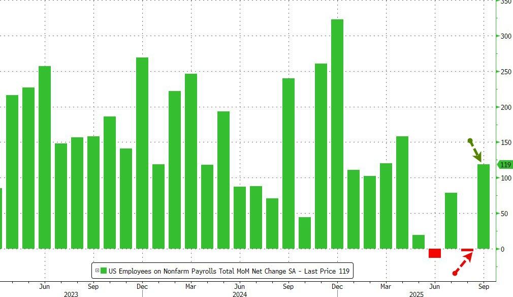 根据报告,美国9月非农就业人口增长11.9万人,是预期5.1万的两倍多,但与此同时,8月份新增就业人数从增长2.2万人下修2.6万,至减少0.4万人,7月和8月非农就业人数合计下修3.3万人,也延续了今年“持续向下修正”的模式。