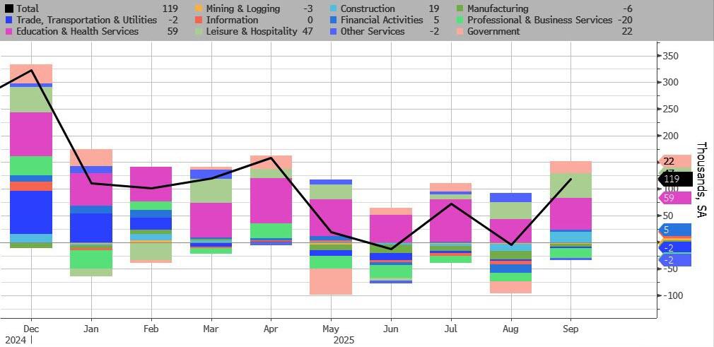 与此形成对比的是,运输和仓储行业在9月减少了2.5万个岗位,主要源于仓储与存储业务减少1.1万岗位,以及快递和投递服务减少7000岗位。联邦政府就业也在9月继续下降,减少了3000人,自1月触及峰值以来累计减少9.7万人。至于其他主要行业,包括采矿、采石、油气开采、建筑、制造业、批发和零售贸易、信息产业、金融活动、专业与商业服务以及其他服务行业,9月的就业水平几乎没有明显变化,基本保持稳定。