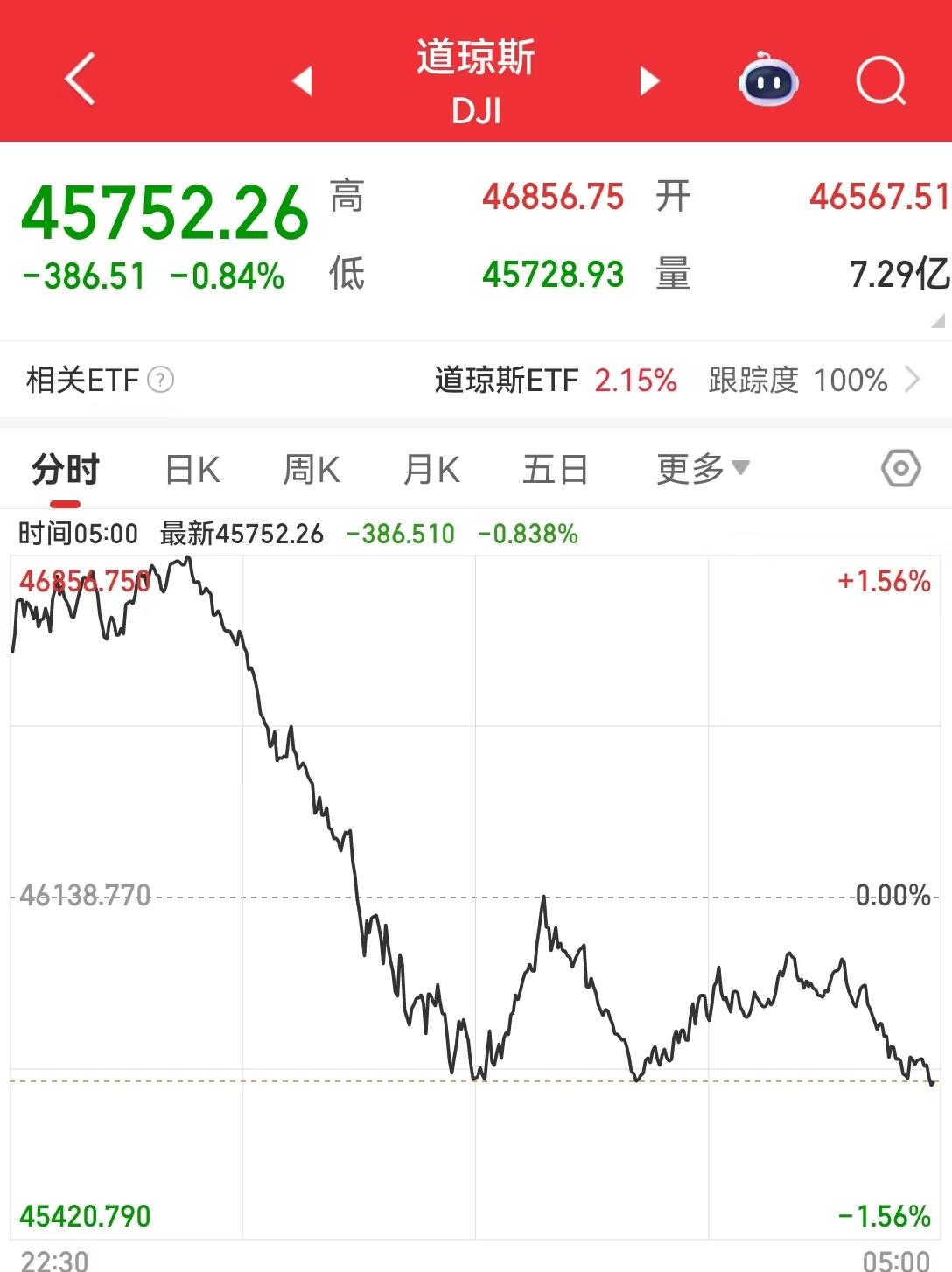 截至收盘,道琼斯指数跌0.84%,标普500指数跌1.56%,纳斯达克综合指数跌2.15%。
