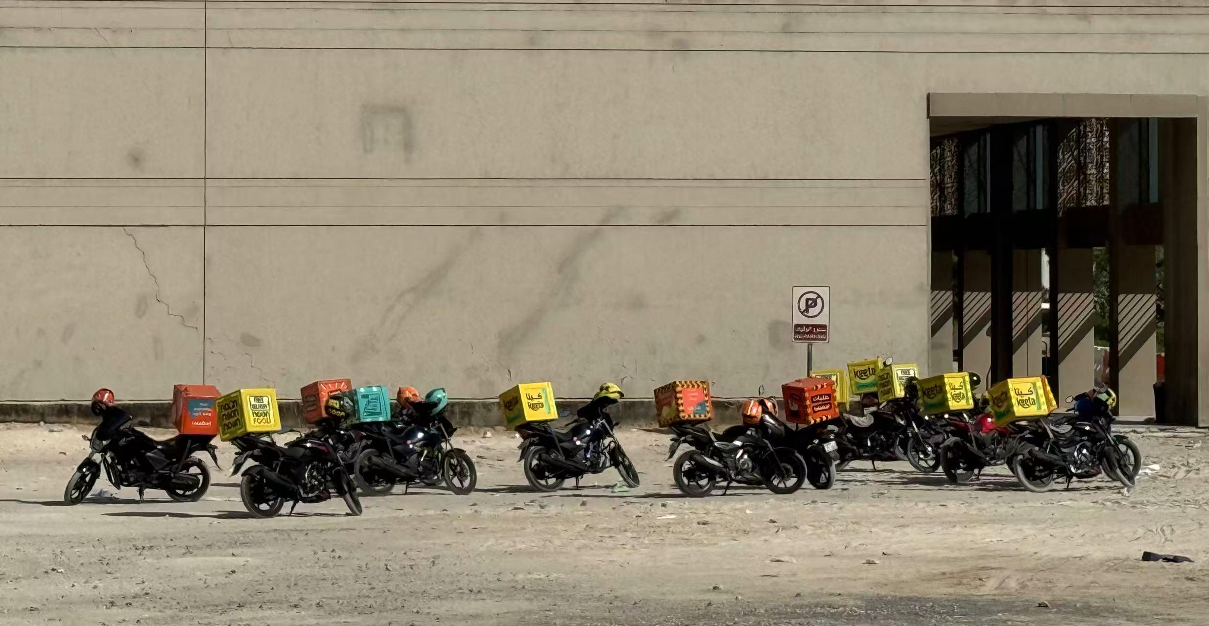 中午时分的迪拜商圈,附近停满了挂着各色外卖箱的摩托车。红、黄、蓝、绿——每个颜色背后,都代表一个试图在这片热土上站稳脚跟的外卖平台。