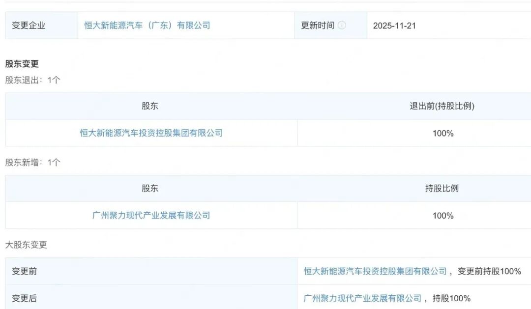 公开消息显示,近日,恒大智能汽车(广东)有限公司、恒大新能源汽车(广东)有限公司发生工商变更,原股东恒大新能源汽车投资控股集团有限公司退出,新增广州国资旗下广州聚力现代产业发展有限公司为全资股东。信息显示,恒大智能汽车(广东)有限公司成立于2018年,注册资本25亿元,恒大新能源汽车(广东)有限公司成立于2019年,注册资本50亿元。