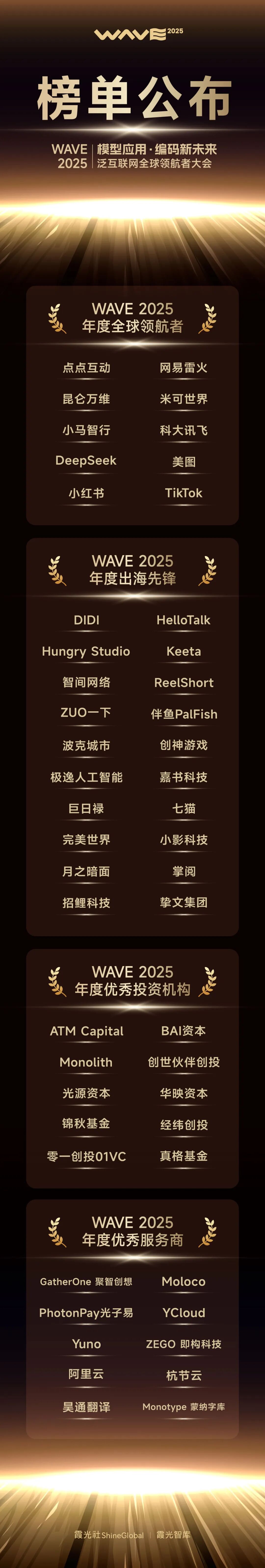 与此同时,一批出海企业已经敏锐地捕捉到趋势的变化,以领航者、先锋的姿态成为泛互联网出海的优秀代表。在此次大会上,霞光社&霞光智库联合第三方机构评选的「WAVE 2025 泛互联网全球领航者年度榜单」揭晓,共有50家知名出海企业/品牌、优秀投资机构、出海服务商入围。