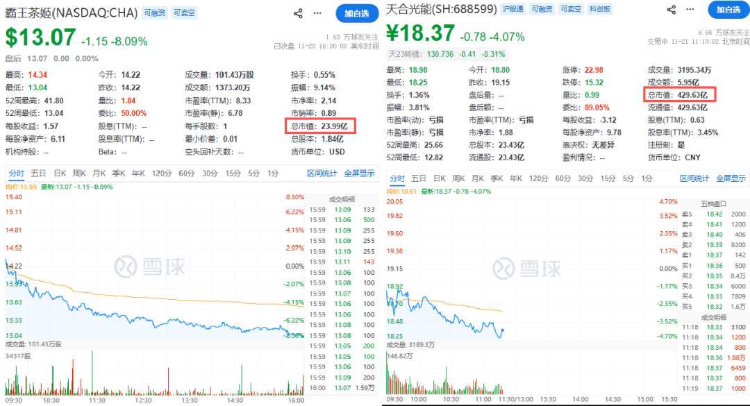 一个是在美股的市值24亿美元(约170亿人民币)霸王茶姬,一个是A股市值431亿的天合光能。
