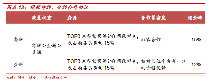 从抽成比例来看,携程对商家的抽佣比例跟所在细分行业和商家的议价能力有关。根据中泰证券研报,携程住宿预订业务综合佣金率在8%-10%左右;对于流量倾斜的特牌、金牌等佣金率更是高达12~15%。