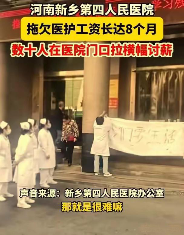就发生在河南的事情,2024年10月,数十名医护人员在新乡第四人民医院门口拉横幅讨薪,公开表示工资被拖欠8个月。