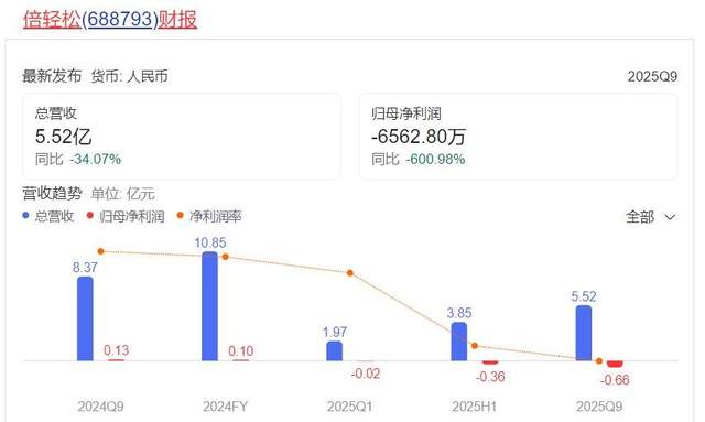 据倍轻松最新财报显示,2025年前三季度营收5.52亿元,同比下滑34.07%,实现归母净利润-6562.80万元,同比骤降600.98%,扣非归母净利润-6667万,同比暴降826.41%,净利润率-11.90%,跌幅高达859.90%。