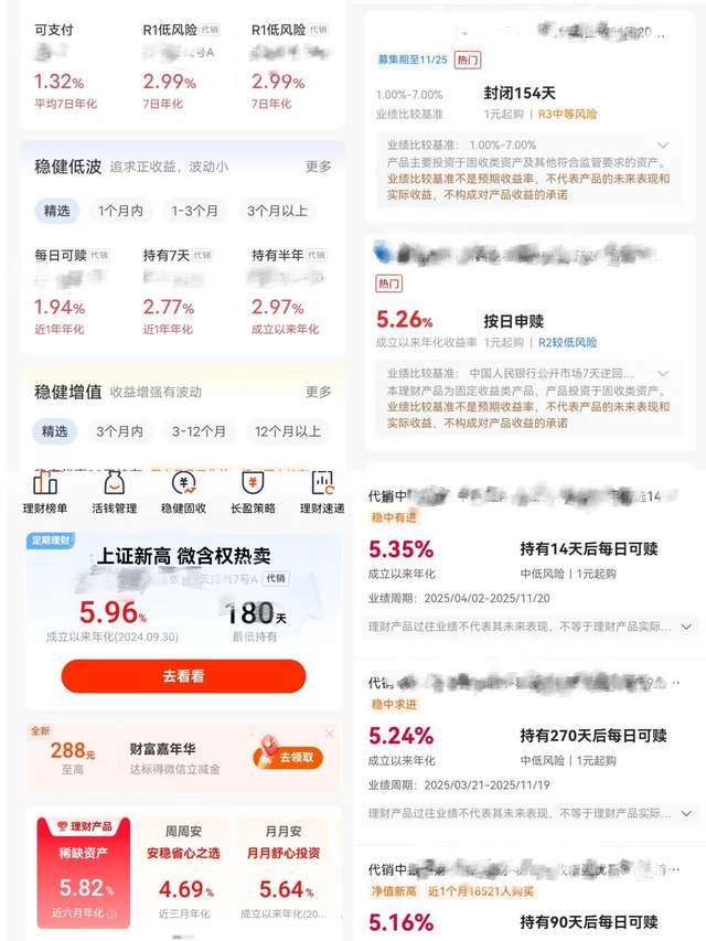 而稳利宝的设计细节贴合了父母辈的需求:收益日历使每日收益清晰可见,产品等级标记明确区分风险,周期灵活提取功能满足家庭临时资金需求,支付宝兄弟平台也增强了父母辈的安全感。