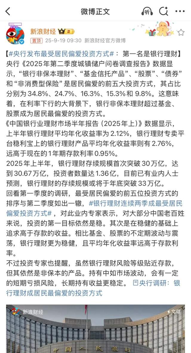 三季度城镇储户问卷更直接点明了市场偏好:仅 18.5% 的居民倾向增加投资,而在具体投资品选择上,“求稳” 成为绝对主流——银行理财以 36% 的占比稳居首位,受欢迎度是股票(17.2%)的两倍多,基金则以 26.4% 位列第二。而像许心月母亲这样的稳健型投资者,仍是市场的绝对主力。