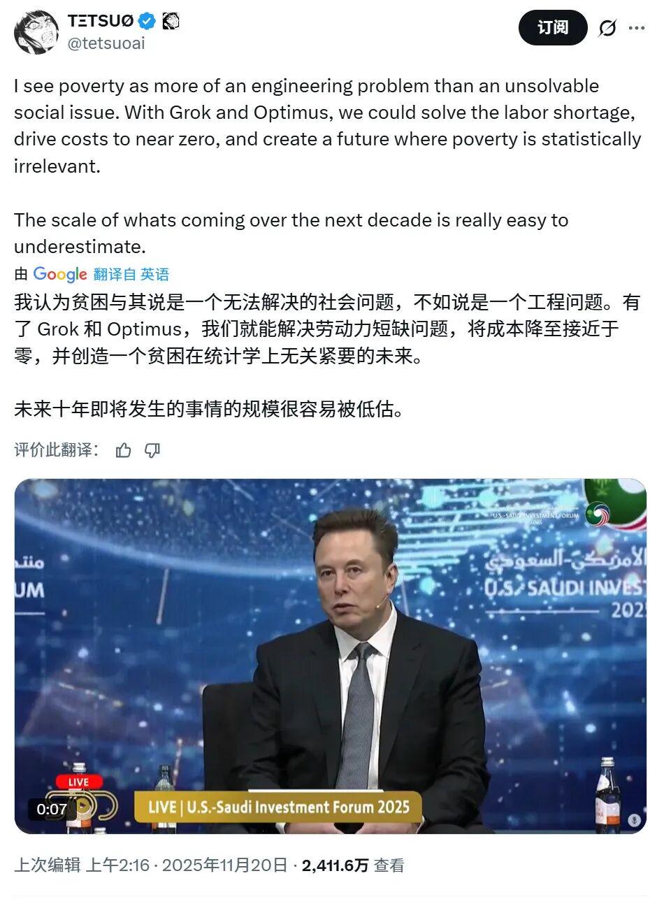 马斯克在最新的2025美国沙特投资论坛上表示,他认为人工智能和机器人会消灭贫困,让每个人更富有。