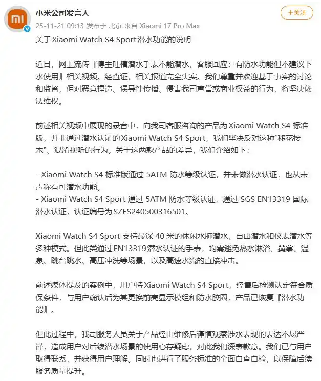 “前述媒体提及的案例中,用户持Xiaomi Watch S4 Sport,经售后检测认定符合质保条件,与用户确认后为其更换前壳显示模组和防水胶圈,产品已恢复“潜水功能”。但此过程中,我司服务人员关于产品经由维修后谨慎观察涉水表现的表达不尽严谨,造成用户对后续潜水场景的使用心存疑虑,对此我们深表歉意。我们已与用户取得联系,并获得用户理解。同时也进行了服务标准的全面自查自检,以保障后续服务质量提升。”