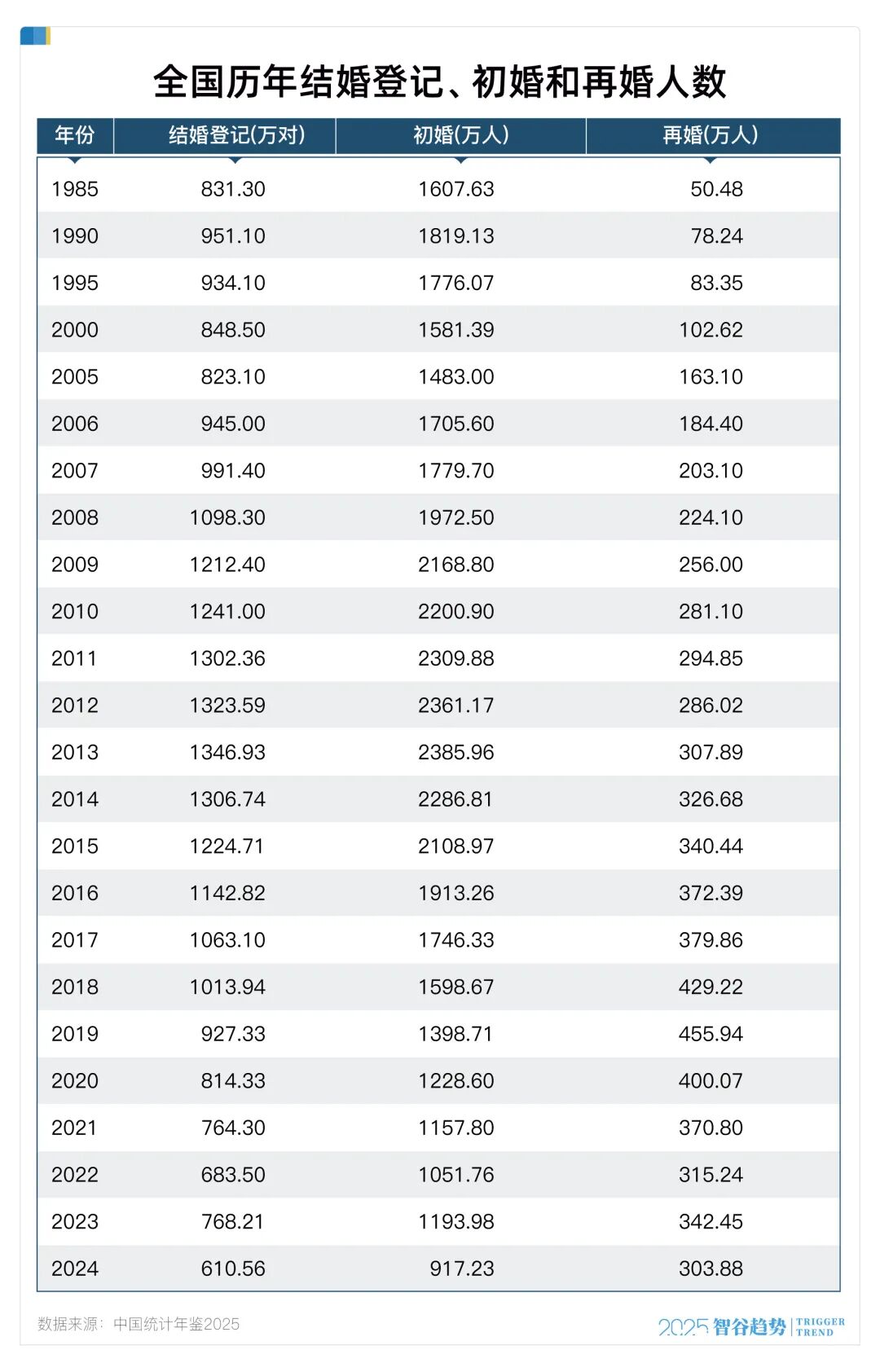 2024年全国结婚登记610.56万对,其中初婚人数仅917.23万人,较上年减少277万人,一年就降了23%,相当惊人。