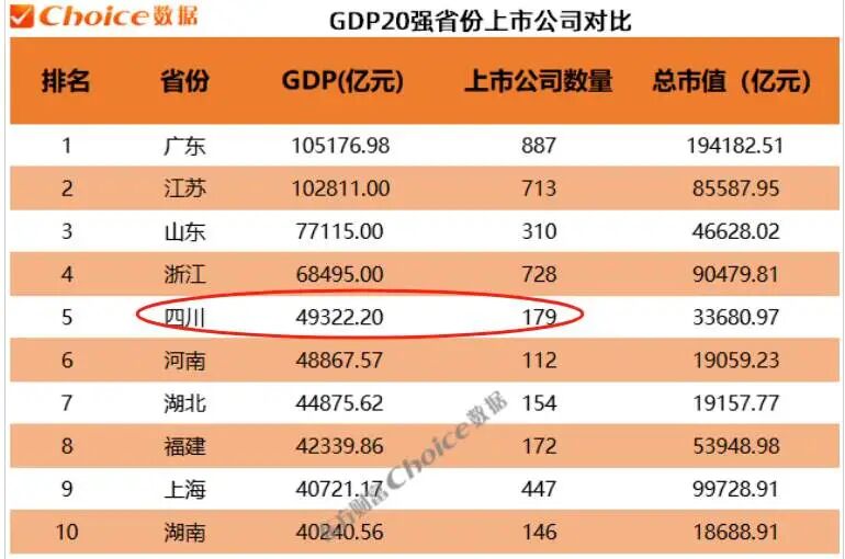 但综合来看,相比于经济排头兵广东,四川省无论是上市公司总数,还是市值超千亿元的企业数量,都存在明显差距。