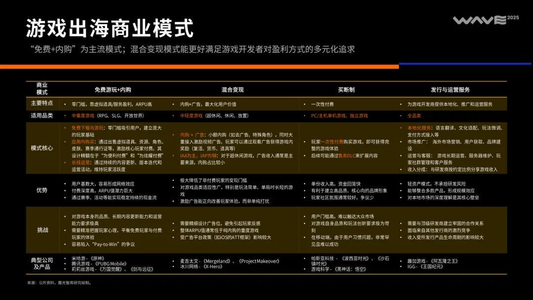 再来看看商业模式。目前游戏出海主要有四种商业模式。免费+内购,是目前的主流变现模式,代表项目就是腾讯游戏的《和平精英》。其他商业模式还有混合变现、买断制,以及负责发行与运营服务变现。目前看,混合变现的模式,更能满足游戏开发者对盈利方式多元化的追求。