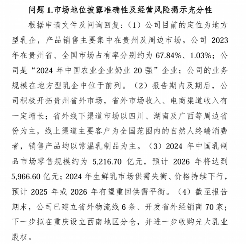 区域集中的双重挑战在于市场空间与竞争压力。一方面,北交所要求南方乳业说明“贵州省内市场是否接近饱和”,尽管其在省内占有率约67.84%,但低温乳制品受限于冷链半径,常温产品又面临伊利、蒙牛等全国性品牌的挤压,增长天花板已现;另一方面,省外拓展步履维艰。西南地区虽为目标市场,但四川、湖南等地已有新希望、皇氏等区域龙头盘踞,南方乳业缺乏品牌认知度与渠道渗透力,其主打产品仍以常温乳制品为主,高毛利的低温品类难以突破物流壁垒。