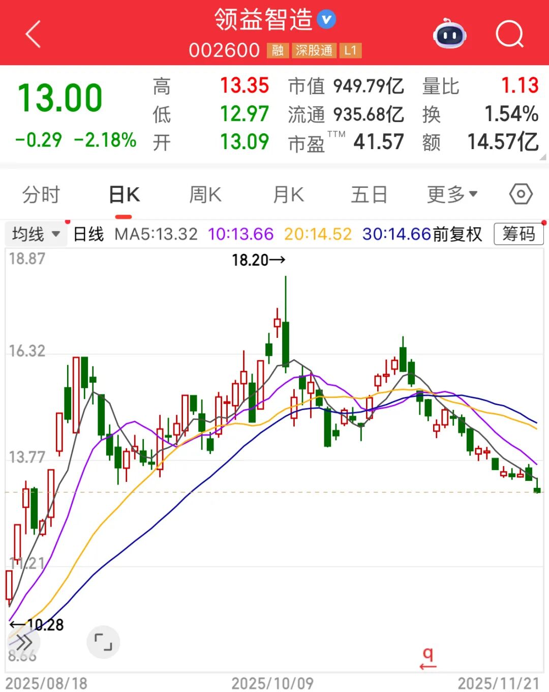2025年,领益智造大幅回升,年内上涨69.45%,截至11月21日收盘,公司总市值达到950亿元。