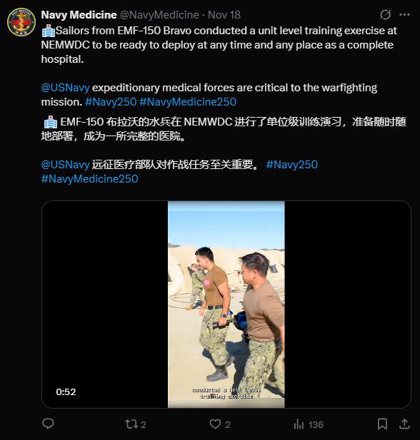 11月18日,美国海军宣布位于美国本土的EMF-150 Bravo单位进行战地医疗演习,准备随时“支援前线”,成为战地医院。