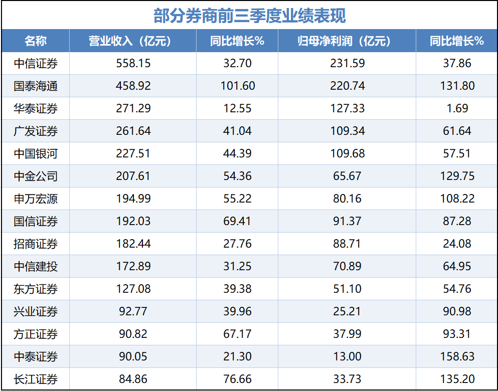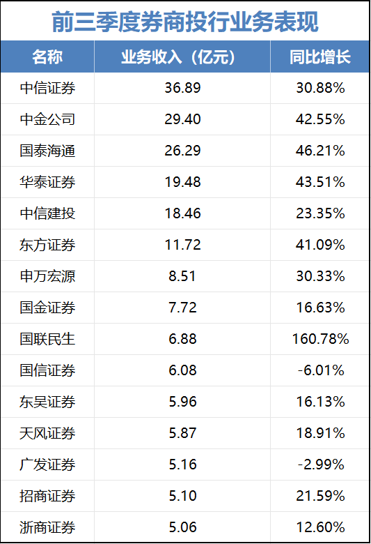 券商业绩爆发,既受“924”行情以来牛市的影响,也有A、港股IPO回暖带来的投行业务收入增长助力。今年前三季度,中信证券、中金公司、国泰海通三家券商的投行收入最高,投行业务收入前15名的券商中,有13家实现了增长。