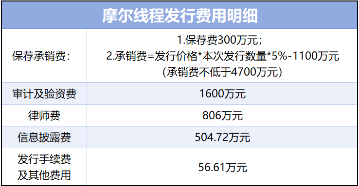 公告显示,此次摩尔线程发行费用主要涵盖五个部分,其中保荐承销费最高,以80亿元的募集资金计算约为3.92亿元。算上审计及验资费、律师费、信息披露费、发行手续费等,合计4.24亿元。