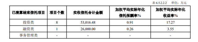 从产品类型看,主动管理型信托规模118.92亿元,其中投资类项目加权平均实际年化收益率高达17.27%;被动管理型信托规模189.01亿元,以事务管理类为主。